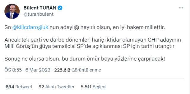 Turan kelamlarına şöyle devam etti: “Ancak tek parti ve darbe periyotları hariç iktidar olamayan CHP adayının Ulusal Görüş’ün güya temsilcisi SP’de açıklanması SP için tarihi utançtır. Sonuç ne olursa olsun, bu durum ömür uzunluğu yüzlerine çarpılacak!”