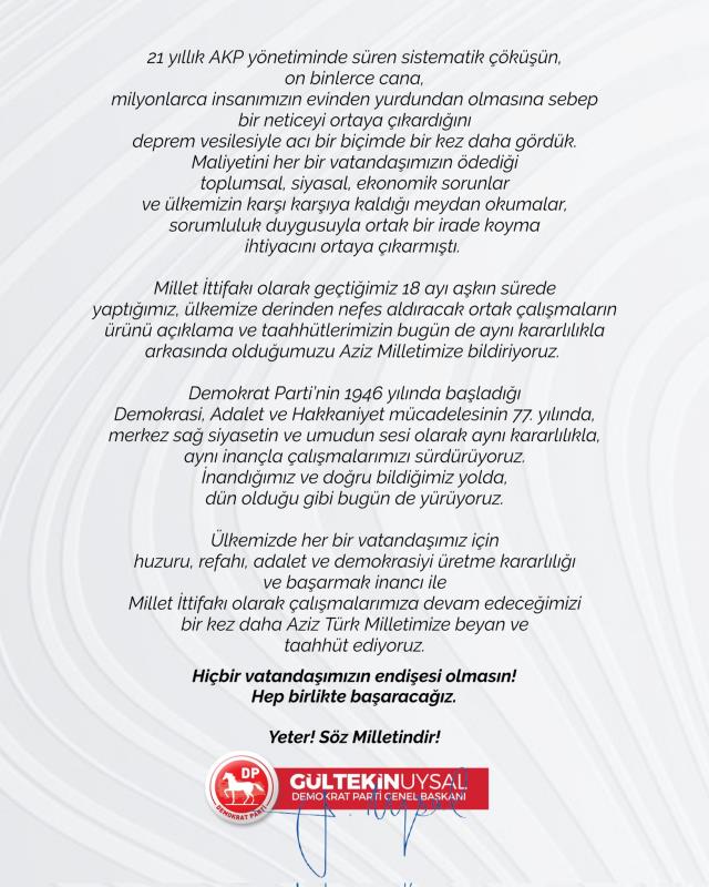 Millet ittifakı olarak geçtiğimiz 18 ayı aşkın müddette yaptığımız, ülkemize derinden nefes aldıracak ortak çalışmaların eseri açıklama ve taahhütlerimizin bugün de birebir kararlılıkla ardında olduğumuzu Aziz Milletimize bildiriyoruz. Demokrat Parti’nin 1946 yılında başladığı Demokrasi, Adalet ve Hakkaniyet gayretinin 77 yılında, merkez sağ siyasetin ve umudun sesi olarak tıpkı kararlılıkla, tıpkı inançla çalışmalarımızı sürdürüyoruz. İnandığımız ve hakikat bildiğimiz yolda, dün olduğu üzere bugün de yürüyoruz.