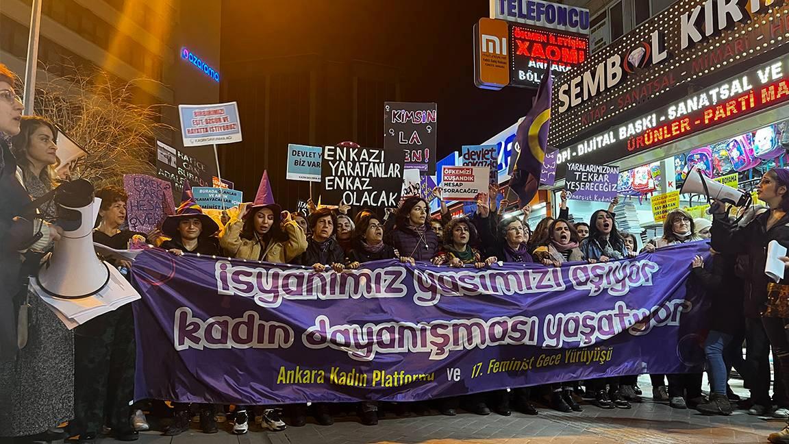 Kadınlar, Ankara Bayan Platformu’nun davetiyle “17. Feminist Gece Yürüyüşü” aksiyonu için saat 19.00’da Sakarya Caddesi’nde toplandı. “İsyanımız yasımızı aşıyor bayan dayanışması yaşatıyor” pankartı taşıyan bayanlar, “Hükümet istifa”, “Asla yalnız yürümeyeceksin”, “Yaşamak istiyoruz özgür ve korkusuzca” sloganları attı. Harekete, HDP Ankara Milletvekili Filiz Kerestecioğlu, Mimarlar Odası Ankara Şube Lideri Tezcan Karakuş Candan ve çok sayıda bayan katıldı.