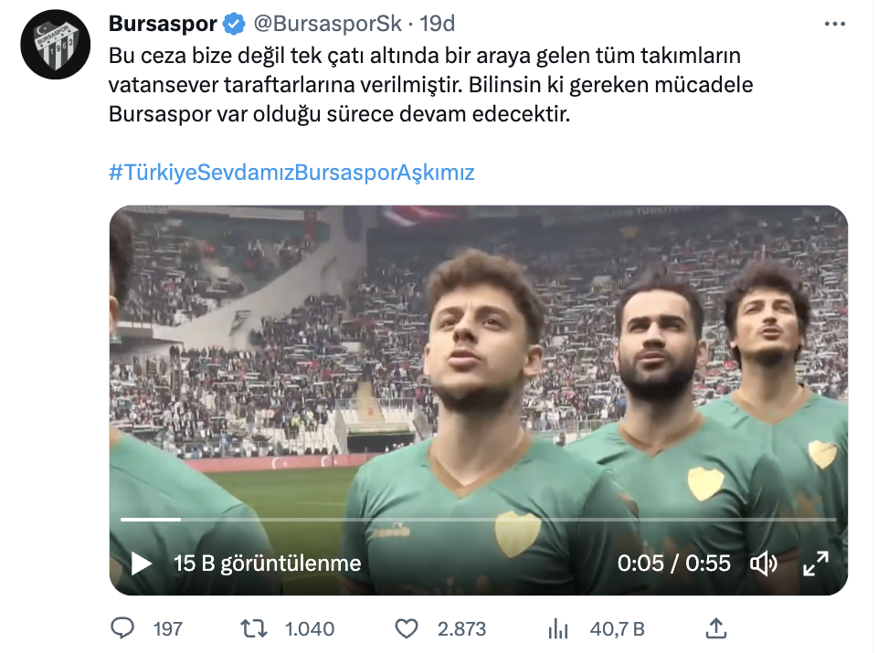 Bursaspor Kulübü’nden kararın akabinde yapılan çıklamada “Bu ceza bize değil tek çatı altında bir ortaya gelen tüm grupların vatansever taraftarlarına verilmiştir. Bilinsin ki gereken çaba Bursaspor var olduğu sürece devam edecektir.” denildi.