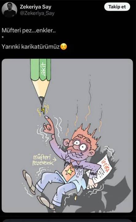 Yeni Akit’in Haber Müdürü Zekeriya Say, elektrik çarpmasıyla alay eden karikatür ve görsel paylaşarak, Yeni Akit’i protesto eden eylemcilere ait olarak hakaret içerikli bildiri paylaştı. Say, reaksiyonların akabinde paylaşımlarını kısa müddette sildi ve hesabını muhafazaya aldı.