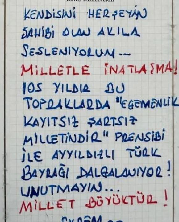 “Kendisini her şeyin sahibi olarak gören akla sesleniyorum. Milletle inatlaşma. 105 yıldır bu topraklarda ‘Egemenlik kayıtsız koşulsuz milletindir’ prensibi ile ay yıldızlı Türk Bayrağı dalgalanıyor! Unutmayın… Millet büyüktür!”