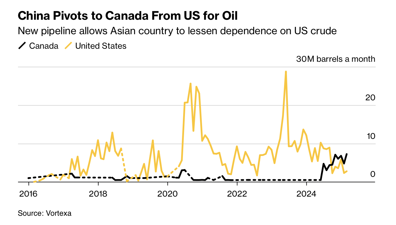 Çin, geçmiş yıllarda büyük oranda petrol ithalatını sağladığı Amerika Birleşik Devletleri yerine Kanada’dan petrol ithalatını sağlayacak.
