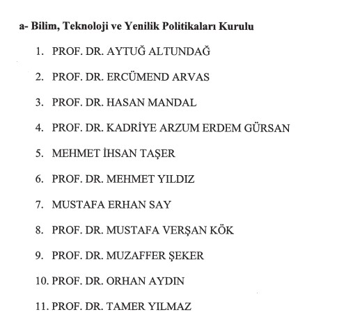 Prof. Dr. Aytuğ Altundağ, Prof. Dr. Ercümend Arvas, Prof. Dr. Hasan Mandal, Prof. Dr. Kadriye Arzum Fazilet Gürsan, Mehmet İhsan Taşer, Prof.Dr. Mehmet Yıldız, Mustafa Erhan Say, Prof. Dr. Mustafa Verşan Kök, Prof. Dr. Muzaffer Şeker, Prof. Dr. Orhan Aydın, Prof. Dr. Tamer Yılmaz.