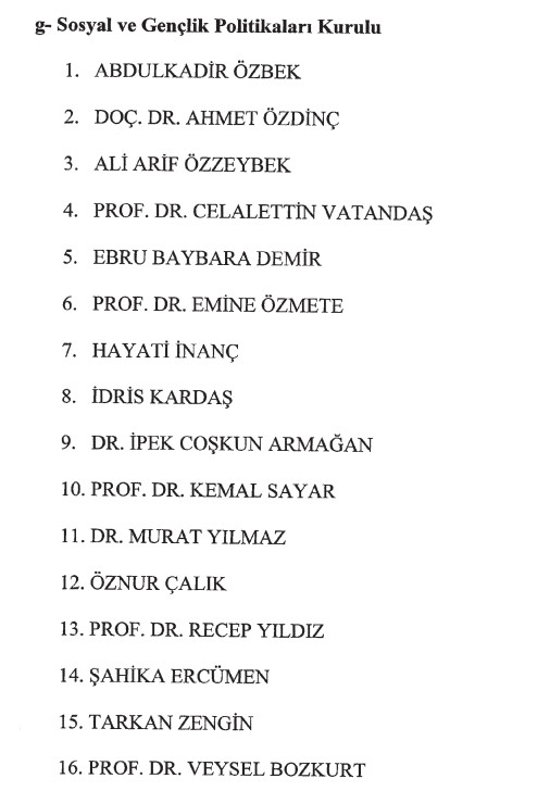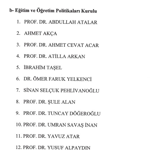 Abdullah Özbek, Doç. Dr. Ahmet Özdinç, Ali Arif Özzeybek, Prof. Dr. Celalettin Vatandaş, Ebru Baybara Demir, Prof. Dr. Emine Özmete, Hayati İnanç, İdris Kardaş, Dr. İpek Coşkun Armağan, Prof. Dr. Kemal Sayar, Dr. Murat Yılmaz, Öznur Çalık, Prof. Dr. Recep Yıldız, Şahika Ercümen, Tarkan Güçlü, Prof. Dr. Veysel Bozkurt.