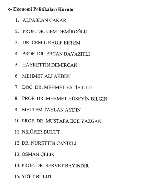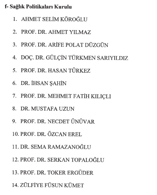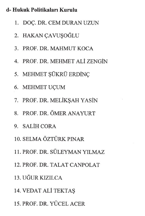 Doç. Dr. Cem Duran Uzun, Hakan Çavuşoğlu, Prof. Dr. Mahmut Koca, Prof. Dr. Mehmet Ali Güçlü, Mehmet Şükrü Erdinç, Mehmet Uçum, Prof. Dr. Melikşah Yasin, Prof. Dr. Ömer Anayurt, Salih Cora, Selma Öztürk Pınar, Prof. Dr. Süleyman Yılmaz, Prof. Dr. Talat Canpolat, Uğur Kızılca, Vedat Ali Tektaş, Prof. Dr. Yücel Acer.
