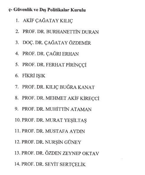 Akif Çağatay Kılıç, Prof. Dr. Burhanettin Duran, Doç. Dr. Çağatay Özdemir, Prof. Dr. Çağrı Erhan, Prof. Dr. Ferhat Pirinççi, Fikri Işık, Prof. Dr. Kılıç Buğra Kanat, Prof. Dr. Mehmet Akif Kireççi, Prof. Dr. Muhittin Ataman, Prof. Dr. Murat Yeşiltaş, Prof. Dr. Mustafa Aydın, Prof. Dr. Nurşin Güney, Prof. Dr. Özden Zeynep Oktav, Prof. Dr. Seyit Sertçelik.