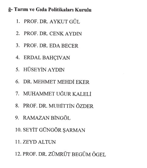 Prof. Dr. Aykut Gül, Prof. Dr. Cenk Aydın, Prof. Dr. Eda Becer, Erdal Bahçıvan, Hüseyin Aydın, Dr. Mehmet Mehdi Eker, Muhammet Uğur Kaleli, Prof. Dr. Muhittin Özder, Ramazan Bingöl, Seyit Güngör Şarman, Zeyd Altun, Prof. Dr. Zümrüt Begüm Ögel.