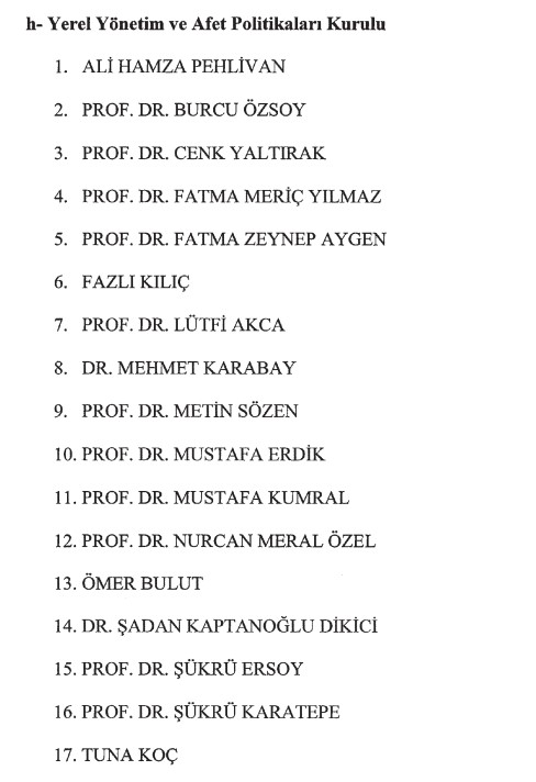 Ali Hamza Pehlivan, Prof. Dr. Burcu Özsoy, Prof. Dr. Cenk Yaltırak, Prof. Dr. Fatma Meriç Yılmaz, Prof. Dr. Fatma Zeynep Aygen, Fazlı Kılıç, Prof. Dr. Lütfi Akça, Dr. Mehmet Karabay, Prof. Dr. Metin Sözen, Prof. Dr. Mustafa Erdik, Prof. Dr. Mustafa Kumral, Prof. Dr. Nurcan Meral Özel, Ömer Bulut, Dr. Şadan Kaptanoğlu Dikici, Prof. Dr. Şükrü Ersoy, Prof. Dr. Şükrü Karatepe, Tuna Koç.