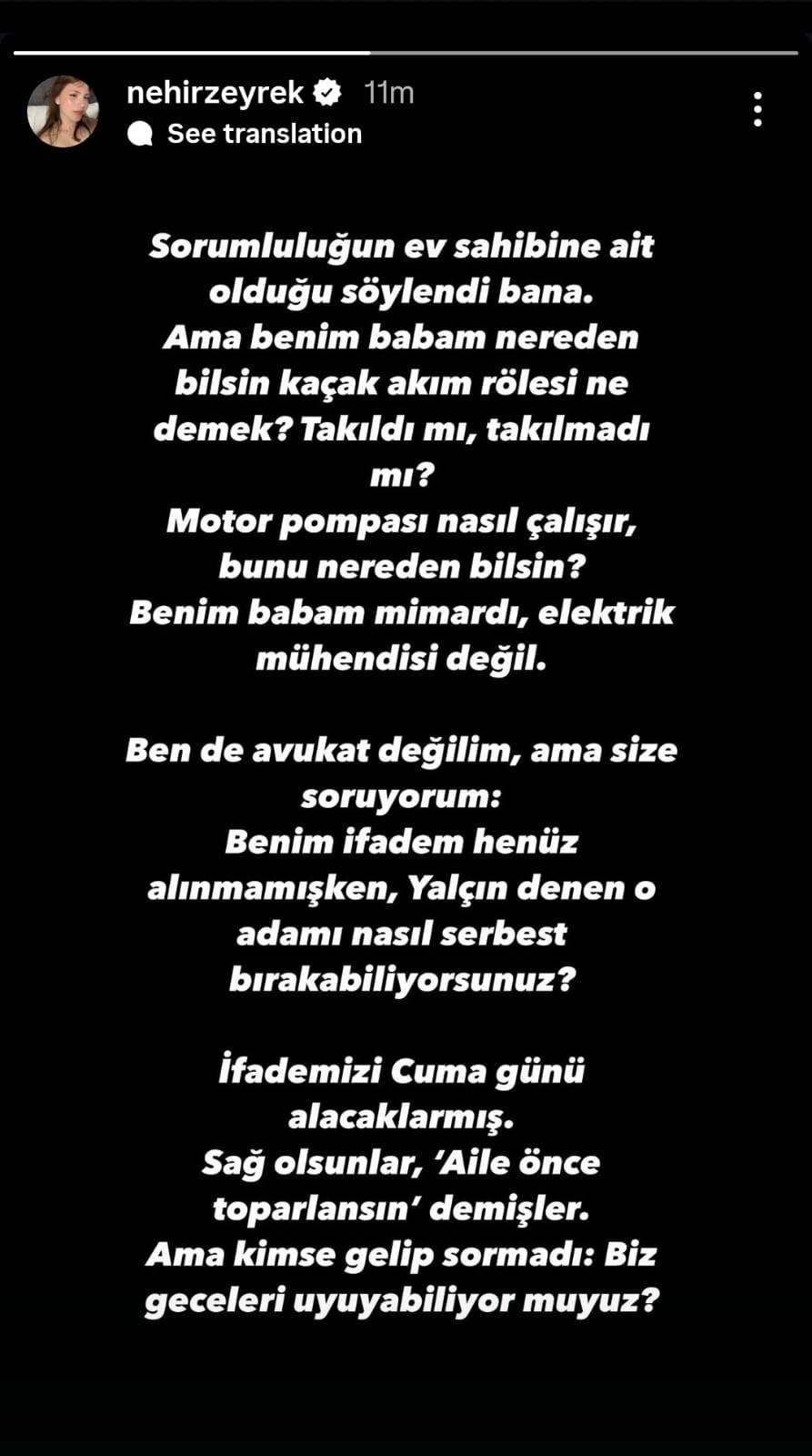 Benim sözüm şimdi alınmamışken, Yalçın denen o adamı nasıl özgür bırakabiliyorsunuz? Sözümüzü Cuma günü alacaklarmış. Sağ olsunlar, ‘Aile evvel toparlansın’ demişler. Lakin kimse gelip sormadı: Biz geceleri uyuyabiliyor muyuz?”