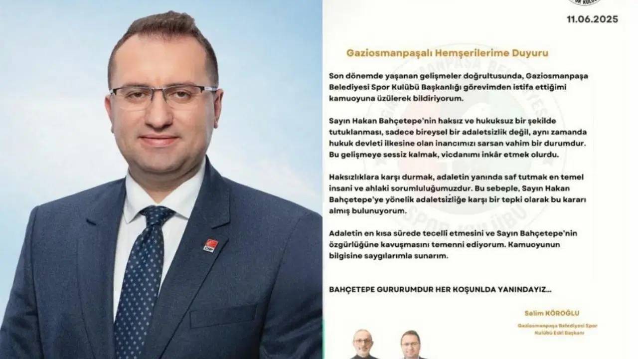 Gaziosmanpaşa Belediyesi Spor Kulübü Lideri Selim Köroğlu, CHP’li Belediye Başkanı Hakan Bahçetepe’nin tutuklanmasına reaksiyon göstererek vazifesinden istifa ettiğini duyurdu. Köroğlu, “Bahçetepe gururumdur, her şartta yanındayız” dedi.