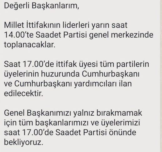 “Değerli liderlerim, Millet İttifakı’nın önderleri, yarın saat 14.00’te Saadet Partisi Genel Merkezi’nde toplanacaklar. Saat 17.00’de ittifak üyelerinin huzurunda cumhurbaşkanı ve cumhurbaşkanı yardımcıları ilan edilecektir.