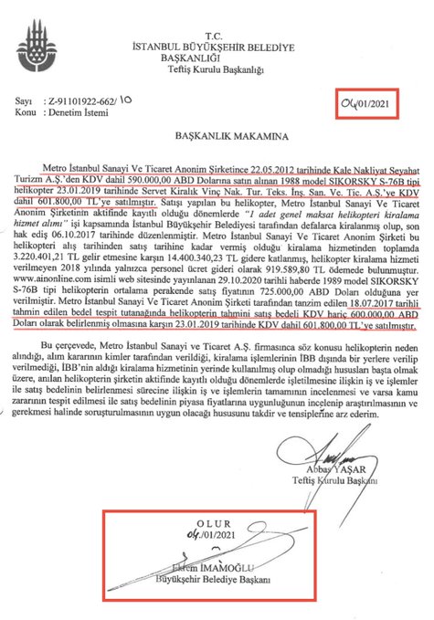 Bu çerçevede, Metro İstanbul Sanayi ve Ticaret A.Ş. firmasınca kelam konusu helikopterin neden alındığı, alım kararının kimler tarafından verildiği, kiralama süreçlerinin İBB dışında bir yerlere verilip verilmediği, İBB’nin aldığı kiralama hizmetinin yerinde kullanılmış olup olmadığı konuları başta olmak üzere, anılan helikopterin şirketin aktifinde kayıtlı olduğu devirlerde işletilmesine ait iş ve süreçler ile satış bedelinin belirlenmesi sürecine ait iş ve süreçlerin tamamının incelenmesi ve varsa kamu ziyanının tespit edilmesi ile satış bedelinin piyasa fiyatlarına uygunluğunun incelenip araştırılmasının ve gerekmesi halinde soruşturulmasının uygun olacağı konusunu takdir ve tensiplerine arz ederim.”