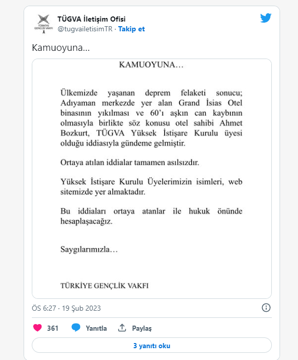 Cumhurbaşkanı Erdoğan’ın oğlu Bilal Erdoğan’ın Yüksek İstişare Heyeti (YİK) üyeleri ortasında yer aldığı TÜGVA bir açıklama ile kuruma ait argümanlara cevap verdi.