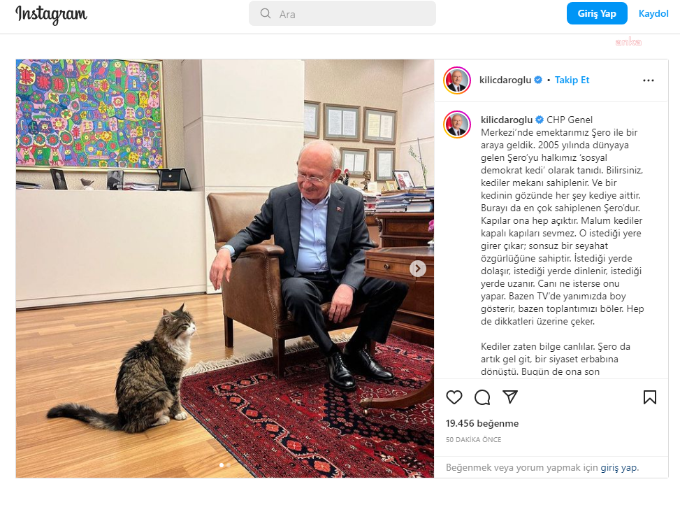 CHP Başkanı Kemal Kılıçdaroğlu, bu akşam Instagram hesabından CHP Genel Merkezi’nin kedisi ‘Şero’ ile partide çekilmiş fotoğraflarını paylaştı. Şero’ya son çalışmalarını anlattığını belirten Kılıçdaroğlu, iktidara gelince yaş mamayı lüks olmaktan çıkaracağını açıkladı.