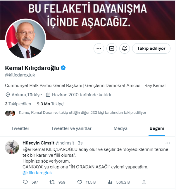 CHP Genel Lideri Kemal Kılıçdaroğlu, Twitter’dan paylaşım yapan Hüseyin Cimşit isimli avukatın, “Kemal Kılıçdaroğlu seçilir ve söylediklerinin bilakis kararlar alırsa Çankaya’da hareket yapacağım” dediği kelamları beğendi.