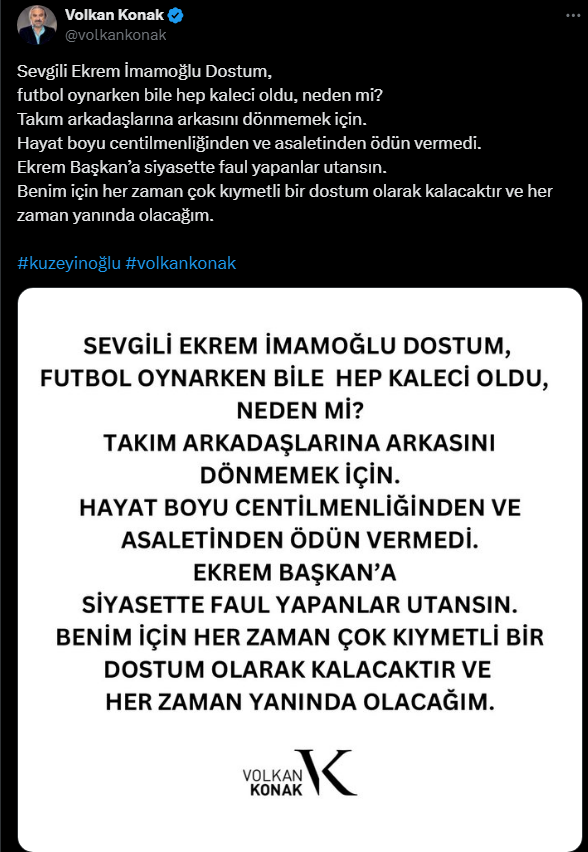 Takım arkadaşlarına gerisini dönmemek için. Hayat uzunluğu centilmenliğinden ve asaletinden ödün vermedi. Ekrem Başkan’a siyasette faul yapanlar utansın. Benim için her vakit çok değerli bir dostum olarak kalacaktır ve her vakit yanında olacağım”
