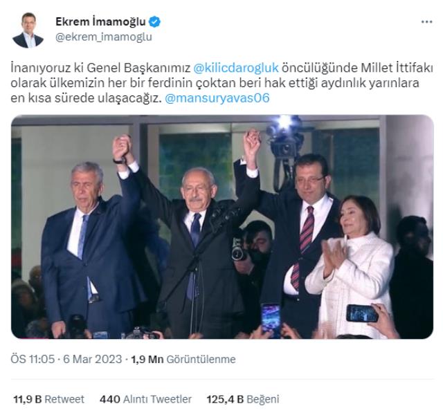Kılıçdaroğlu’nun adaylığının ilanı sonrası Yavaş ve İmamoğlu’ndan birinci açıklama geldi. Toplumsal medya hesabından paylaşım yapan İBB Lideri Ekrem İmamoğlu, “İnanıyoruz ki Genel Liderimiz öncülüğünde Millet İttifakı olarak ülkemizin her bir ferdinin çoktan beri hak ettiği aydınlık yarınlara en kısa müddette ulaşacağız” dedi.