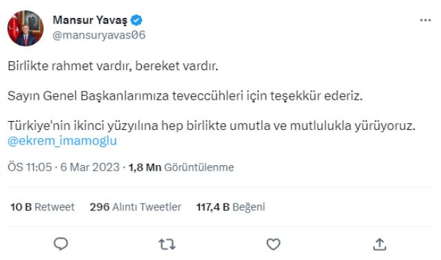 Ankara Büyükşehir Belediye Lideri Mansur Yavaş ise, “Birlikte rahmet vardır, rahmet vardır. Sayın Genel Liderlerimize teveccühleri için teşekkür ederiz. Türkiye’nin ikinci yüzyılına daima birlikte umutla ve memnunlukla yürüyoruz” tabirlerini kullandı.