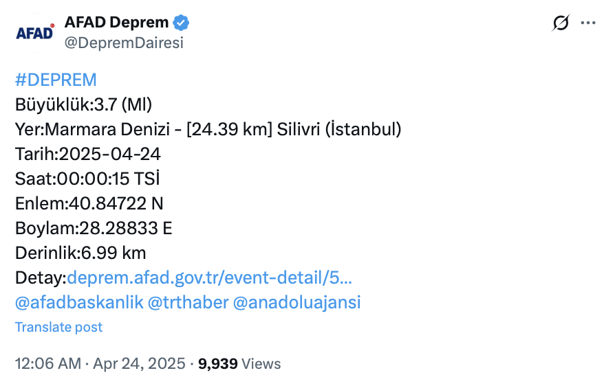 Marmara Denizi’nde meydana gelen 6,2 büyüklüğündeki sarsıntının artçı sarsıntıları sürüyor. AFAD, 24 Nisan saat 00.00’da 3.7 büyüklüğünde bir zelzele daha olduğunu açıkladı.