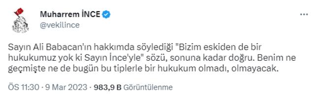 Muharrem İnce, Babacan’ın kelamlarına sert bir cevap verdi. Toplumsal medya üzerinden paylaşım yapan İnce, “Sayın Ali Babacan’ın hakkımda söylediği ‘Bizim evvelce de bir hukukumuz yok ki Sayın İnce’yle’ kelamı, sonuna kadar yanlışsız. Benim ne geçmişte ne de bugün bu tiplerle bir hukukum olmadı, olmayacak.” dedi.