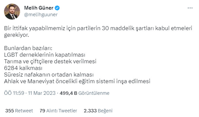 Partisinin AK Parti ile görüşmesi sonrası Tekrar Refah Partisi Gençlik Kolları Genel Lideri Melih Güner, şu paylaşımı yapmıştı: “Bir ittifak yapabilmemiz için partilerin 30 unsurluk kuralları kabul etmeleri gerekiyor. Bunlardan kimileri: